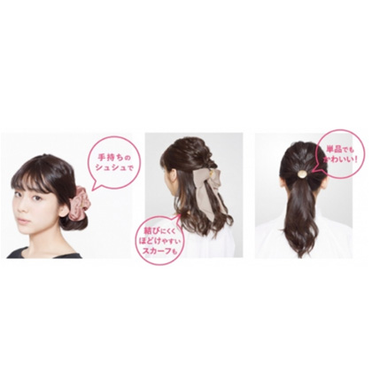 - 手持ちのシュシュやスカーフ、バンダナと合わせて、ヘアアクセサリーを簡単カスタマイズ。