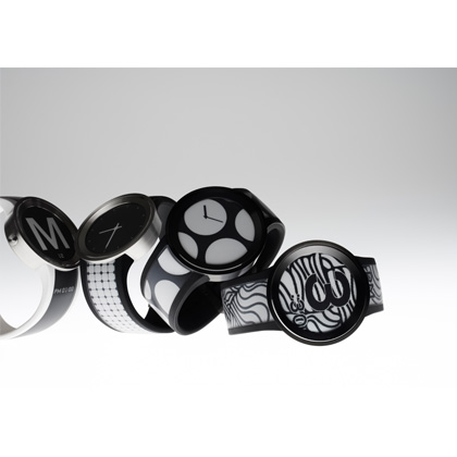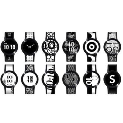 - 文字盤とベルトが一枚の電子ペーパーでできた、ディスプレイウォッチ。ボタンを押すだけで時計全体の柄が変わり、スマートフォンアプリを使えばデザインの追加も可能。