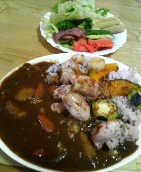 焼き野菜を乗せて、辛口カレーを昼間にビールと一緒にいただきます!