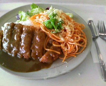 トンカツ、ピラフ、スパゲッティーが一つの皿に盛られた料理なんです。