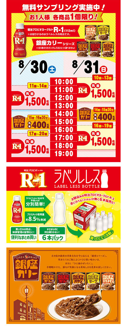 「強さひきだす乳酸菌」のフレーズでおなじみのヨーグルト「明治プロビオヨーグルトR-1ドリンクタイプ」と発売から30年を超えるロングセラー「銀座カリー」各種を無料サンプリング♪