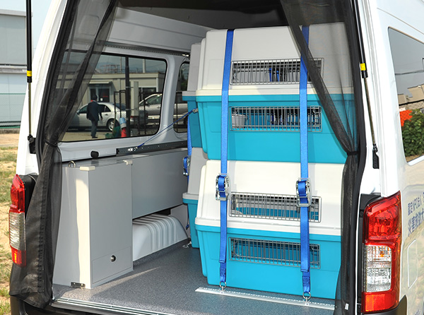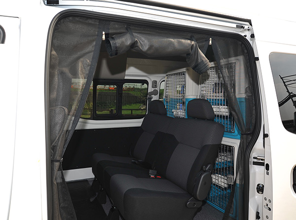 今までの災害救助犬を輸送している車両は一般のワゴン車が主流で、スタッフや救助犬の乗るスペースに限界がありました。またゲージが揺れて救助犬にストレスが溜まりやすい環境でした。 今回製作した車両では、これまで贈呈してきた福祉車両のノウハウを活かしてゲージをしっかりと固定しています。また、理想の積載能力の実現にも成功しています。