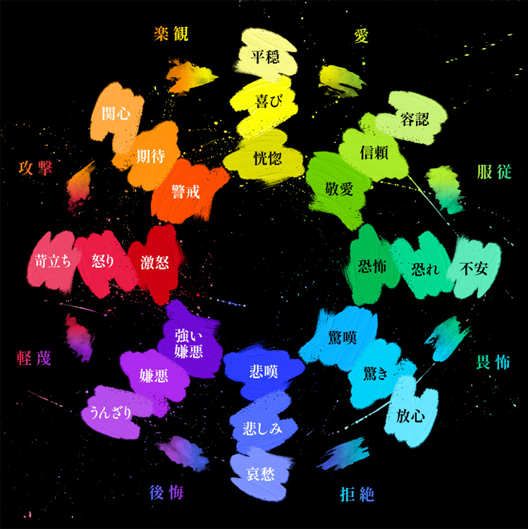 といった原色を元にして、その原色を混ぜ合わせることで、多種多様な色を生み出すことが出来るのと同様に、感情も、基本となる感情同士が混ざり合うことで色々な感情が誕生すると提唱。
