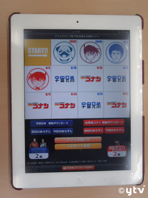 みなさま、夏休み真っ盛り、暑さに負けていませんか?というわけでこの8月いっぱい、毎週土曜日夕方から放送しているYTVアニメ2作品で夏休み応援企画!「宇宙兄弟×名探偵コナン スタンプラリープレゼント企画」実施中です。これは8月の「宇宙兄弟」と「名探偵コナン」の放送時間中に“データ放送”または“スマートフォンアプリ”から参加できるというもの。もちろん両方からだってOK。これから参加でも全然大丈夫で大歓迎なので、http://www.ytv.co.jp/anime_stamp/ へアクセスしてぜひ参加してみて下さい。