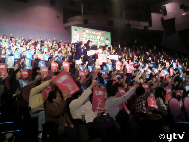 その熱い想いを代弁してくれたのが、初日挨拶の舞台に立っていただいた5人いや6人。ルパン三世役の栗田貫一さん、コナン役の高山みなみさん、そしてアラン・スミシー役の内野聖陽さん、クラウディア役の夏菜さん。司会のNTVアナ・石田エレーヌさんの進行によって楽しいお話が目白押し。もちろんルパンの衣装を着たコナン君も一緒です。特に“もしvs(ヴァーサス)させるのなら何と何?”という問いに、内野さんの答えは「不二子ちゃんのおふろシーンvsしずかちゃんのおふろシーン」。うーん、問いが柔らかい!クリカンさんの「相棒vs臨場」ご自分のモノマネ右京さんと内野さんのホンモノ倉石さんのバトルなんて、確かに奇跡のコラボで場内大爆笑!ほかにもPR活動の舞台ウラなど面白いネタが満載の舞台挨拶になりました。冒頭の写真は会場のお客さまたちと登壇者の方々との撮影タイムの様子です。