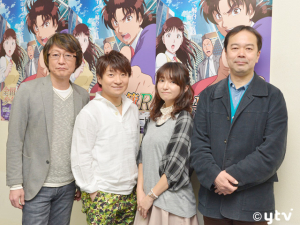 このほど第2話のアフレコに合わせて新番組「金田一少年の事件簿R(リターンズ)」の囲み会見が行われました。参加してくれたのは金田一一役の松野太紀さん、七瀬美雪役の中川亜紀子さん、剣持勇警部役の小杉十郎太さん。僕も番組プロデューサーとして参加いたしました。冒頭の写真はその4人(左から小杉さん松野さん中川さん僕)です。