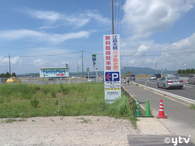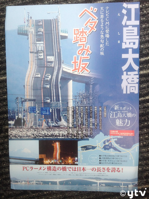 松江から米子に移動する際に中海にかかっている橋がCMで有名になった「ベタ踏み坂」。チラシのような写真はなかなか撮れないのですが、それでも迫力のある坂道は良くわかります。近くの臨時駐車場には観光バスも立ち寄ったりで、有力な観光地になりつつありますね。面白い現象だと思います。写真はチラシと橋手前の交差点から坂を撮影したものと臨時駐車場です。