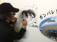 サミット会場入口に石巻の「石ノ森萬画館」への大きな応援メッセージ幕があって、会場に来られた漫画家の先生の直筆の直筆寄せ書きがありました。その新しいのに急遽青山先生がデカいコナン君を描きます。その時会場へ入場待ちしてたお客さんは、直に先生のコナン君ナマ描きを見れてホントラッキー、確かに今まで僕の目の前で直接描いた中では一番大きいコナン君だったんじゃないでしょうか。(冒頭写真(2))