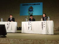 そしてその近くの別会場に移動して行われたのが「西原理恵子の人生画力対決」。ビッグコミックスペリオール誌連載中の西原さんとゲストのマンガ家がその画力を競う?人気企画マンガであります。300人以上のお客さんが集まった会場には、まず平井鳥取県知事も応援に登壇。そして今回その対決相手が青山先生というわけで、僕も旧知の小学館ビッグ企画室編集長・八巻和弘さんの司会進行で対決スタート。まずはお二人の代表作のキャラクターを描きあってアイドリング暖めてさっそくのお題が「金田一少年」。(写真(3)が舞台の様子。実際の絵は詳しくお題を書いちゃってますが連載をお楽しみに)