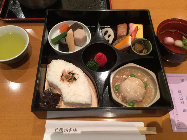 舞台下手につながる歌舞伎特有の花道がある劇場内の様子など、劇場から上演の仕方までイロイロも含めて本当に興味を引きつけられ面白かったです。何事も知らないママということはアカンですね。すべてにおいてそれなりに探求した上で、自分のすべき事を考えていかないと。というわけで1月25日まで上演中ですがチケットはHPなどでチェックした方が良いですね。そしてもしご覧になる場合は詳しい方はともかく普通のみなさまは「解説イヤホン」を借りて聞きながら観た方がGOOD!。短い休憩中に地下2階にあるレストランでいただくお弁当も趣があり、2015年早々にこんな経験が出来て、なんだか良いスタートが切れた気がします。2枚目の写真は公演ポスター、3枚目はいただいたお弁当です。雰囲気あるでしょ。