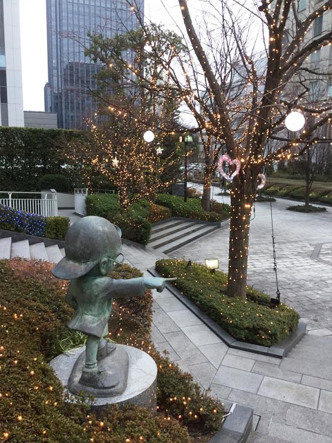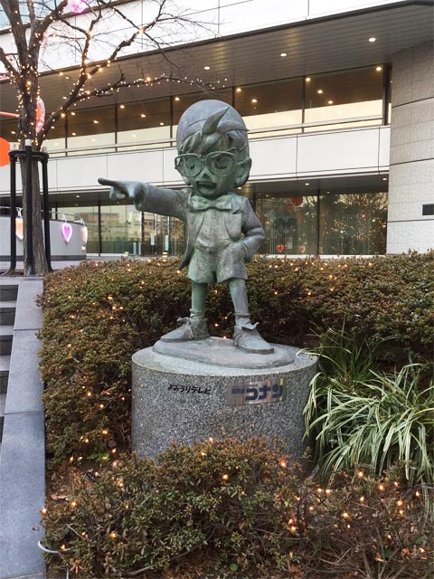 みなさま、青山先生のふるさと・鳥取県北栄町以外で唯一コナン像が立っているのが、大阪市中央区・読売テレビ本社前ということはご存知ですよね。そして今、大阪環状線・京橋駅近くにある読売テレビ周りを夕方訪問すると、玄関前一帯がステキにライトアップされてます。環状線外回り京橋駅から発車したすぐ右手にYTV社屋が見えるのですが、コナン像が立ってる正面玄関は反対側なので、お時間のある方はぜひ一度京橋で下車して訪れてみて下さいませ。子供たちの写真撮影スポットにもなっているこのコナン像、台座の碑文を見ると2002年12月建立となっています。もう12年以上「真実はいつもひとつ」し続けてくれてるんですね。冒頭の写真はそのコナン像とライトアップされてる周りの様子です。