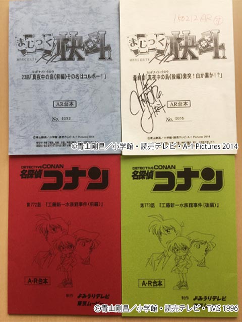 さらには28日の放送でももうひとアクションあります。「まじっく快斗1412」最終回から「名探偵コナン 工藤新一の水族館事件(後編)」まで、こちらもじっくりご覧になって下さいね。必ずヘぇ~っていう場面に出会いますよ。冒頭の写真はそれぞれのアフレコ台本です。