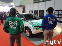 久しぶりに乗った大阪臨海側を走る都市交通ニュートラム。通勤列車並みに混んだこの電車に乗って、インテックス大阪で開催された「大阪モーターショー」に行ってきました。今回は未来を感じさせるものすごい車たちに混じって、「輪廻のラグランジェ」アートカーの展示がされてるのでその応援です。2番会場の入り口を入るとすぐの場所に、我らがまどかのウォクス・みどりをーイメージしたもうおなじみの日産ジュークがお客様を迎えてくれます。