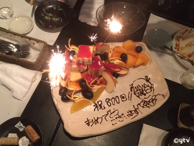 高山さんを中心にほぼ毎回収録後には食事をしていますので、この日の乾杯~!もだいたい800回目。すべては番組を支えてくれてるファンのみなさまのおかげ。なので、この日は作画からアフレコ収録そしてその後の乾杯まで、800回の気持ちを込めたステキな一日を過ごすことが出来ました。冒頭の写真は音響監督の浦上さんが作ってくれた800回記念バームクーヘンプレート(キャンドルが800になってます)と、乾杯したお店でプレゼントされた800回デザートプレートです。