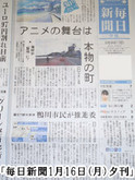 そしてまたびっくりするニュース!?が飛び込んできました。「輪廻のラグランジェ」に関する記事が1月16日毎日新聞夕刊の一面を飾ったのです。写真を見てください。僕も長いことアニメの仕事をしていますがこんなことは初めて。というか新聞一面にのる、なんて聞くとドキドキしちゃいません?タイトルになってる「アニメの舞台は本物の町」はもちろん鴨川市のことですが、最近はアニメの舞台になった場所を訪れることを聖地巡礼なんて言いますからね。この『タイミングでこんな方向からも世間の注目を集めることが出来るなんて、ラグりんは僕たち制作者の想い以上に奥深い作品なのかも知れません。こちらの記事は、WEB版毎日新聞の毎日jpでも読むことができるので、見てみてくださいね。さあこの週末からは第3話「鴨川にランの花咲く」、出揃った主人公3人の女の子を中心にドラマがどんどん展開していきます。各地各局チェックしてお見逃し無いようにしてください。