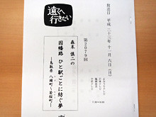 翌日曜朝7時アニメ「べるぜバブ」で楽しんだあとは一部地域を除いて、1970年10月スタートという長寿旅番組「遠くへ行きたい」が放送されてます。何を隠そう?僕はこの番組の最長期間宣伝担当でありました。15周年から25周年あたりなのでもう20年ほど前のことになります。今回超久しぶりに番組MA現場訪問をしてきました。理由は森末慎二さんに会うためです。テレビマンユニオンプロデューサー村田さんも演出の森さんも懐かしかったなあ。というわけで「遠くへ行きたい」森末慎二さんの鳥取の旅は11月6日日曜朝「べるぜバブ」のあと7時30分放送です。青山先生の故郷・鳥取県だけあってわれらがコナン君キャラもチラッと登場、そしてローカルな「若桜(わかさ)鉄道」いいなあ、行ってみたいなあ。写真はこの回の台本、これも懐かしいです。