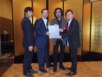 でも本当に良かったのはその後、受賞者や関係者での懇親会であります。同じく特別賞を受けられた、故出崎統さん[89]のお兄さん・制作会社マジックバス社長の出崎哲さんとも久しぶりに会話出来ました。そしてずーっと、縁がありそうでなかなかお目にかかれなかったアニメ監督・大地丙太郎さんとついに初対面。積もり積もった想いをお話し出来たことは大きかったなあ。おそらく時間をおかずに東京で再会できるでしょう。冒頭の写真は受賞懇親会での左から石山CP・僕・山本監督・チャップ、それといただいた盾です。