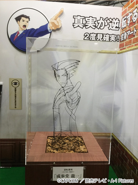 というわけでわがYTVブースの目玉は「ハリガネアート」。どういうものかと言うと、ある方向から見ると「逆転裁判」の主人公・成歩堂くん、90度回って見るとコナンくんになると言う優れもの。(冒頭の2枚の写真はそれぞれの方向から見たキャラクター)初めて見た時は驚きました、これは本当にセンスある芸術ですね。制作された造形作家・武藤裕志さんに話を聞きましたが、原作者が違うキャラクター同士は難しいとのこと。実際は例えばコナンと蘭みたいに作者が同じキャラクターの方が作りやすいそうです。これはぜひそっちも見てみたいですよね。このハリガネアート、この後もいろんな場所にお目見えする予定なので、番組HPなどのチェックを忘れずにね。
