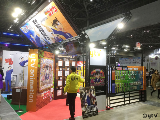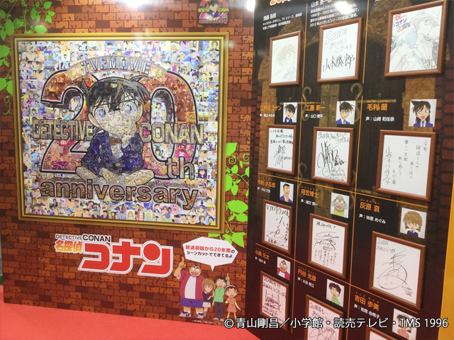 もう一つの目玉は800話を超える名場面シーンで綴る「名探偵コナン」20周年ロゴです(冒頭の写真3枚目)。こーゆーのって本当に制作するスタッフの熱意がそのまま絵に現れてきます。その強烈な根気と手間には本当にアタマが下がります。ちなみにその右側にはアニメコナンに出演いただいてる役者のみなさんのサイン色紙が飾られています。これも今回の20周年のタイミングでコメントも書き込んでもらった特別バージョンなんですよ。YTVブースでは他にも「名探偵コナン」主題歌の歴史として全曲のCDを展示したり、コナングッズなどの販売も。
