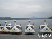 さてさて先週この日記で紹介した「洞爺湖アニメ漫画フェスタ」。イベントは現地スタッフや多くのお客さんのおかげで大成功に終わりました。で、印象深かったイベントに負けず感動したのがこの土地そのものでした。この洞爺湖町には過去一度訪れ、昭和新山などの見学もしたことがあるのですが、今回は地元のスタッフにアナ場も案内もされて、町の素顔に充分触れることができました。たとえば「洞爺湖ビジターセンター 火山科学館」の展示や映像がすごい!2000年3月の有珠山噴火の折には印象的なニュースだったなあ、という程度の記憶にすべて事実の裏打ちができたのは僕にとって大きいものでした。当時の実際の火山活動の地殻影響がそのまま保存されている「有珠山 西山火口散策路」などの“火山遺構”も驚異的で、その手の自然現象はちょっと興味のある分野なので短い時間でしたが堪能してしまいました。2枚の写真はまずその散策路入り口から見た風景。噴火の影響で道路と交差点が陥没し車は放置され、水が池のようにたまってるのがわかります。もう一枚は洞爺湖畔に並ぶスワンボート、遠くに見えるは羊蹄山です。