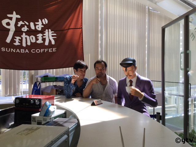 会場外には20周年を記念した展示物もいろいろ揃え、ここで改めてコナンの歴史を感じてくれた人もいたんじゃないかな。建築デザインも秀逸なイベント会場、倉吉未来中心の大きなメインステージ会場の3階まで埋め尽くし、サブホールまで埋め尽くした1700人を超えるお客さまに、コナンがらみの素敵な夏のひとときを味わってもらえたなら本当に最高です。おいでいただいた方々、本当にありがとうございました。来れなかった方は申し訳ありませんが冒頭の写真を見て、思いを馳せて下さいませ。1枚目のステージ奥からの写真は改めて見てその活気を思い出します。向かって右から中尾アナ・ボク・かっぺ~ちゃん・みなみさん・わかなさん・力也さん・オキシジェン三好博道さん・田中さんの8人です。2枚目は始める前のステージセットの様子。ボクは一人用のイスに腰掛けていたんですよ。3枚目は「鳥取砂丘コナン空港」の「すなば珈琲」カウンターで小山力也さんと毛利小五郎さんとの3人ショット(笑)。というわけで楽しく大成功なコナンまつりでした。まんが王国とっとり、日本海テレビをはじめとしたイベントスタッフのみなさま、お疲れさまでしたありがとうございましたm(_ _)m