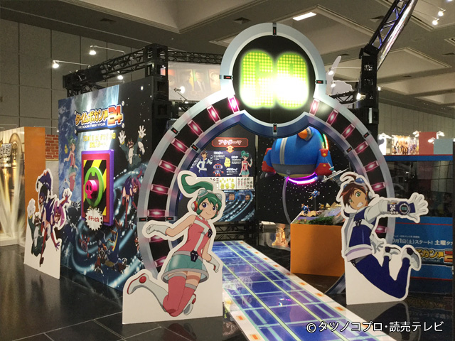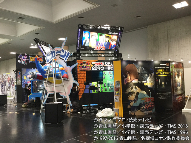 YTVのメインは新番組「タイムボカン24(トゥエンティーフォー)」。巨大なメカブトンを中心にタイムボカンの世界観の中にタイムワープするような作り込みコーナーが秀逸。会場のあちこちに設置されたナゾを解く「リアルナゾトキラリー」解答シートを持って移動するお客さまが続出、解答できたら特製クリアファイルをゲットできました。さらにその横で、まだまだ20周年企画が続いている「名探偵コナン」のボードがお客さんの目を引いていましたね。冒頭の写真は準備中のYTVブースと“タイムボカン24展示”の様子です。