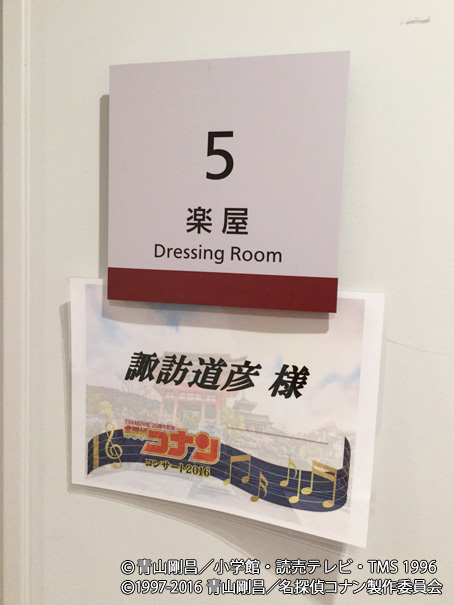 そして9月17日限定、京まふ第3会場「ロームシアター京都」では「『名探偵コナン』コンサート2016 IN 京まふ」の2回公演が行われました。今年のゴールデンウィーク、大阪と東京2か所限定公演が大好評で、ここ京都での登場となりました。ボクもあの演奏を思い出して、ひとり「ジーン」となりました。…が、今回はそんなコトを言ってる余裕がない。…というのも、ゲストは高山みなみさんでコナンファンにステキなお話をしてもらえるのですが、その横になんとボクも立つことになったのです。こんなスゴいステージで何をお話して良いのか悩みましたね〜。写真はコンサートリハーサルの様子とめったにあることではないボクの楽屋表示。