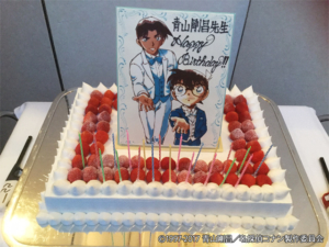 昨年同様、青山剛昌先生の乾杯の後、製作委員会各社の挨拶があり、それぞれにとって「いかに今回の映画がすごいものであったか」を語ってくれます。各社なりの立場や見方を持ったお話が面白く、各社の個性が見事に出てましたね。そしてこの時期一番のイベントが6月21日が誕生日という青山先生のバースデーお祝い!先生の画を描いた特製ケーキがすごい。これまでの劇場版本数21本のろうそくを吹き消した青山さんの元に、高山さんがでっかい花束を持って登場。いっぱいのお祝いに文字通り華を添えます。それにしてもケーキの上に飾られたコナン・平次の絵がステキでかっこいい。そのケーキもみんなで美味しくいただいて、女性スタッフ中心にゴキゲンだったことは特にお伝えしておきましょう。