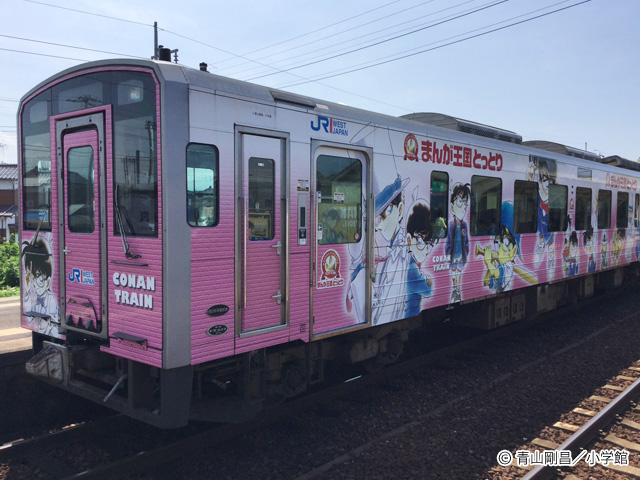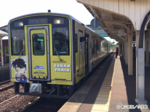 実はボクはその次の日プライベートで米花町、じゃない、北栄町を散策。今年3月にオープンした「米花町商店街」や「青山剛昌ふるさと館」を満喫。朝倉書店では毎年お正月に青山先生が寄贈するサイン色紙をじっくり見学、さらに2003年に出版された懐かしくもきれいな「コナンドリル」を買ったりしました。会社にある本はみんなで読みまくってボロボロになってます。そして極め付け、コナン駅こと由良駅で、2編成しか走っていないコナン列車も両方の撮影に成功したんですよ。