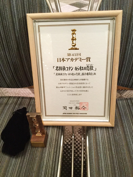 そんな折、劇場版「名探偵コナン から紅の恋歌(ラブレター)」が日本アカデミー賞 優秀アニメーション作品賞をいただきました。この賞、実は劇場版名探偵コナンとしては受賞8度目!今回は昨年一年間に公開されたアニメーション作品から選ばれた5作品のうちの一本ということになります。本当にありがとうございました!