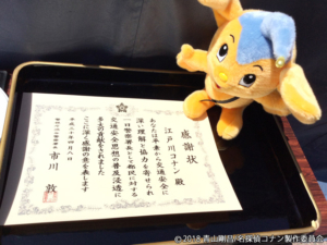 あと4月8日、日曜日に東京渋谷で行われた渋谷交通安全セレモニーの様子を写真でお見せしますね。好天のもと、渋谷ハチ公像のすぐ前で行われたイベントなのですが、行き交う大勢の人たちの注目も集めていました。この日一日警察署長に任命された江戸川コナン君、これってやっぱり超ふさわしい感じですよね。会場を歩き回ってた8人の“犯人さん”も面白すぎます。渋谷警察市川署長はじめスタッフのみなさま、そしてお集まりいただいたコナンファンのみなさま、本当にありがとうございました!