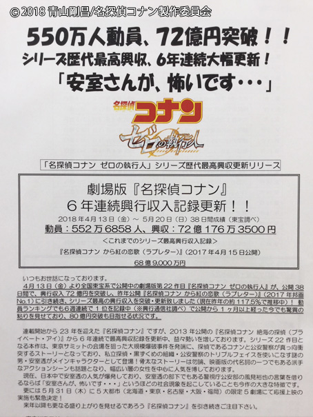 というわけで「ゼロの執行人」は5月21日にこんなタイトルのリリースが出てしまいました。『550万人動員、72億円突破‼シリーズ歴代最高興収、6年連続大幅更新!「安室さんが、怖いです…」』この勢いで5月31日には5大都市(北海道・東京・名古屋・大阪・福岡)の限定5劇場で応援上映の実施も緊急決定!だそうです。…重ねて申し上げさせていただきますが、この超ミラクルな快進撃は、すべてコナンファンのみなさまの応援のおかげです。このことに強く深く感謝いたしながら、引き続きまい進していく所存です。引き続き毎週の少年サンデーとTVシリーズの「名探偵コナン」をどうかよろしくお願いいたします!