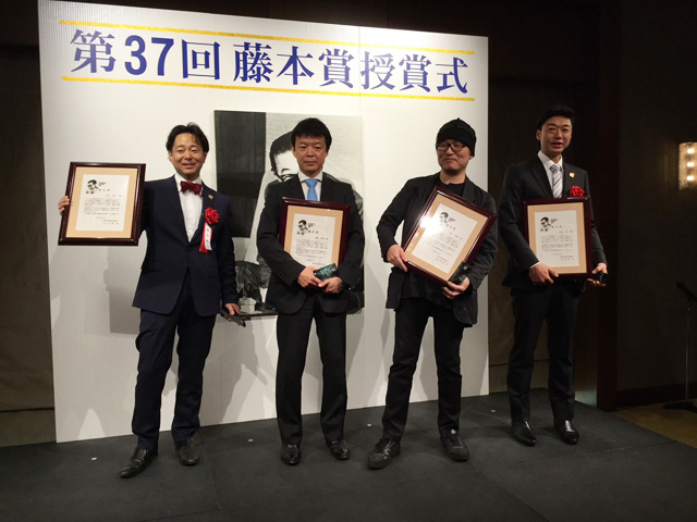 ネットのニュースにも流れていましたが青山先生のコメントをここで紹介しますね。「『藤本賞』というのは映画界における沢村(栄治)賞だと聞きまして、巨人ファンで野球ファンの僕は取れてとてもうれしいです。巨人の連敗も昨日止まりましたし、この賞に恥じないようにこれからもがんばっていこうと思います」さすがのユーモアです。表彰式の後の懇談会も笑顔の大勢の関係者に囲まれ祝福され、まさにスタッフ全員のチームワークの勝利とも言えますね。懇談会中も写真撮影などいっぱいお疲れ様です。青山先生と3人のプロデューサー、本当におめでとうございました!
