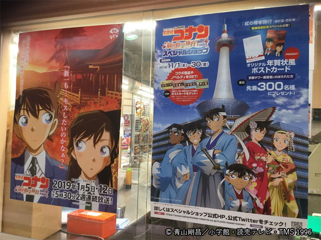 京都タワー、帰りのエレベーターもしっかりコナンと平次の声に送られて終了。このイベント限定のグッズも豊富で、学生さんたちには良い修学旅行の思い出になってくれたかも?です。そして来年早々にもう一度ご自分の修学旅行を思い出しながら、「紅の修学旅行」放送を見て楽しんじゃう!なんて、ホント完璧な流れじゃないですか。実はこのイベント、主催はトムス・エンタテインメントさんなのです。作品に取り組んでいる会社が自社作業エリアだけでなく、いろんな企画や形で作品を盛り上げていける。これが今の「名探偵コナン」の強みの一つかもしれません。