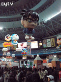 冒頭の写真でお分かりのように、毎度のごとくでっかいコナンアドバルーンが少年サンデーブースの場所を教えてくれます。今回は教室を模したステージで、名探偵コナンの特別な授業が行なわれるという設定。講師の先生はわれらがコナン役・高山みなみさん、そして今回の映画に合わせて工藤新一&怪盗キッド役・山口勝平さんです(2枚目の写真右側2人)。もちろん着ぐるみコナン君も司会のおねーさんも大活躍。