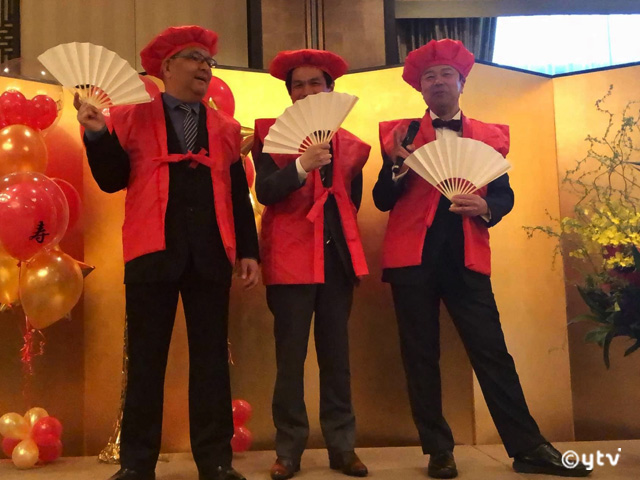 明1神会館ホールで、左から4月14日同日に還暦を迎えたKADOKAWA渡辺隆史さんと音響監督なかのとおるさん、そしてボク。赤いのはワインだけでいい!ってがんばって拒んでいたけど、結局赤いちゃんちゃんこを着せさられて赤帽かぶってしまいました。
