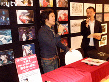 12月23日、吉祥寺パルコ6F「犬夜叉プレミアムショップ〜1月4日まで」において彼の握手会が開催されました(写真2枚はその様子。左がかっペーちゃんで右は進行役のYTV斎藤P)。予定人数以上の110人のファンが3回に分かれてきれいに並んでひとりずつ、かっぺーちゃんと握手しながら思い思いの会話をしていきます。近くで見ていた僕も思わずほころぶステキな光景です。何より驚くのはかっペーちゃんの自然体。どのファンに対しても距離や対応が普通です、ノーマルです。まるで目の前に迫る雄大な大自然が、いやいつもこうなんだけど…、って答えるが如くです。