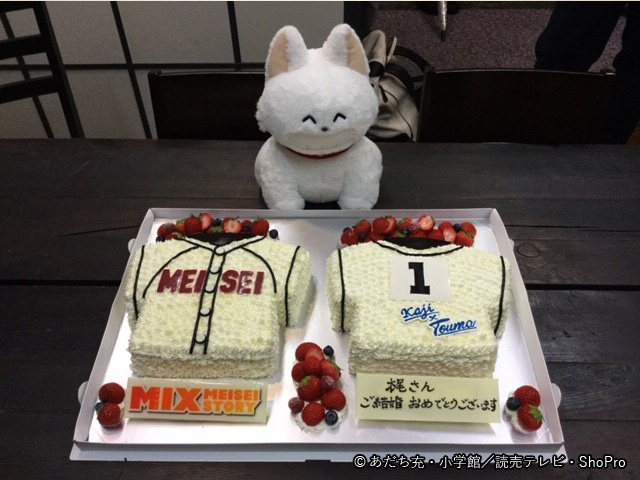 さらにもう一つハッピーな情報を共有します。ネットニュースなどでも大きく報じられていましたが、「MIX」の立花投馬役の梶裕貴さんがご結婚されました。快調にピッチャーをしている梶さんに、番組アフレコのあとスタッフ一同でステキなケーキをご用意して、みんなでお祝いさせていただきました。パンチも笑顔でお祝いしてる写真をご覧いただき、ハッピーなお裾分けをどうぞ。