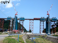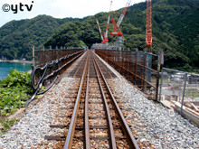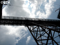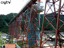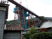 約40mの高さにある餘部の駅に下から行く方法は完全に徒歩しかありません。途中の階段から直に赤い鉄骨に触れられる場所もあり、幾重にも塗られたであろう朱色のペンキに、果てしない人間の知恵と労力を感じます。本来の赤い架橋の向こうにありながら、建設中の次代をになう四角い大きな柱も強い存在感を主張してます。強い日差しに汗をかきながらも時間を忘れ登り切り、眼下に望む餘部の町並みや海にも風土的味わいを感じます。プラットホームのみの駅、踏切から鉄橋方面にまっすぐに伸びる線路など、近い将来の風景の変身に想いをはせ、なぜか妙なミステリー感覚に襲われてしまいました。この時期に行けて良かった。コナンミステリーツアーにご参加のみなさん、もし時間があれば城崎温泉から電車で約1時間弱、人間の産業遺産とも言うべき鉄橋に足を伸ばされてはいかがでしょうか。