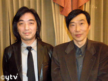 その日の内にスタッフ約25人は新幹線で大阪へ移動。19日は大阪のTOHOシネマズ西宮(昨年秋オープンというこの映画館もすごい!もう王宮にでも迷い込んだかのようなゴージャス映画館ですよ)、TOHOシネマズ梅田で高山さん、山崎さん、コナン君&蘭ちゃんの着ぐるみによる舞台あいさつが行われました。YTV脇浜アナの進行により、ステージ上では楽しいトークが繰り広げられました(冒頭の写真は西宮でのもの、左端が脇浜アナ)。劇場まで足を運んでくれた観客のみなさん、役者陣やDAIGOさんのパブリシティへの出演、スタッフの尋常じゃない努力もあり、すべてがうまく回っていって、おかげさまで公開初日から素晴らしい好成績を収める事ができました。ここで作品の骨格を成すお2人のツーショット写真をどうぞ。山本監督(左)と脚本・古内さんです。