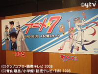 先週の金曜日、東京・日本テレビ汐留本社で10月20日よる7時にスタートする新番組「アニメ☆7(セブン)」の記者会見を行い、たくさんの報道陣が駆けつけてくれました(写真(1)は会見ステージのバックパネル)。会見には「名探偵コナン」からコナン役の高山みなみさん、新一と怪盗キッドの2役を演じる山口勝平さん、「ヤッターマン」からドロンジョ役の小原乃梨子さん、ナレーションやヤッターワンなどを演じる山寺宏一さんが出席してくれました。高山さんの「真実はいつも一つ」を皮切りに役者さんたちはそれぞれ自分が演じる役柄の名台詞を言いながら登場してくれたんだ。山口さんは「「LADIES&GENTLEMAN アニメ☆7の幕が上がるぜ〜」とキッド風に番組スタートの狼煙を上げてくれました。