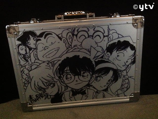 僕は初号ではいつも仕事で持ち歩いていたジュラルミンケースをスクリーンの下に置いておくことにしています。もちろんそのケースには青山先生に描いてもらったコナン君たちがいて、これは完成したばかりの映画に向けてのスタッフ感謝や大ヒット祈願を込めたジンクスみたいな行動です。写真は試写が始まる前に撮ったものとケースです。