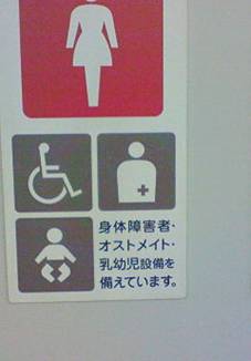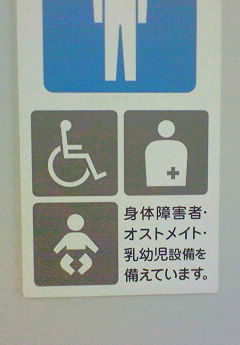 駅の公衆トイレにこういった表示が増えている(表示がある)ということは、オストメイトの人たちが使える公衆トイレが増えている(と言うか、ようやくそういった動きが出てきた)ということで、バリアフリーやユニバーサルデザインの考えから言うと、喜ばしいことではないでしょうか。もちろん、まだまだ数は多くないのでしょうが。そんなことにようやく気づいた一日でした。