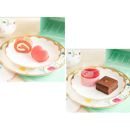 スイーツ4種(薔薇のムース フロマージュ、特製マカロン、ガトー・オペラ、ラズベリーロールケーキ)
