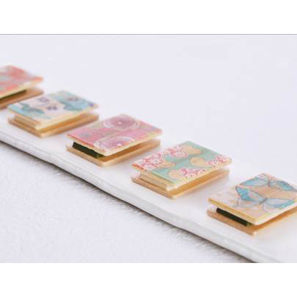 - 滋賀県産のもち米(滋賀羽二重もち)の芳ばしい最中種に、くちどけのよい和のチョコレート(抹茶・きな粉)を挟んで味わうチョコ最中。