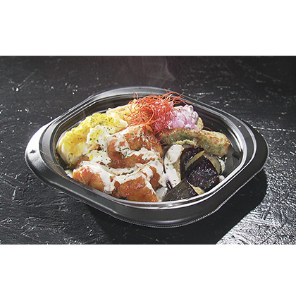 新感覚の『おばんざいオーバーライス』が人気のお店です。 - 鶏チリ、カレーポテサラ、磯部上げとタルタルソース、きんぴらの胡麻和え、茄子の揚げ浸しがご飯の上に乗っていてかき混ぜて食べる丼ぶりです。