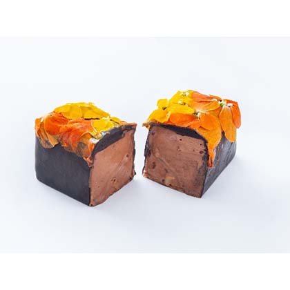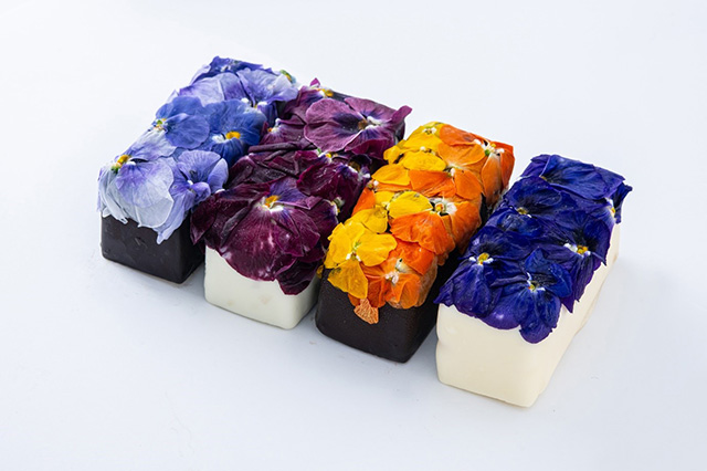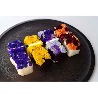 ムース状にした食材をチョコレートでコーティングし、エディブルフラワーと生春巻きで包んだ見た目はなんとも鮮やかで華やか! - 味はフォアグラ×白トリュフ、アボカド×ラズベリー、チーズ×パッションフルーツ、カカオの4種