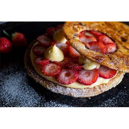 世界初の特注プレスマシンのおかげでパリパリ触感!焼きたてのミルフィーユが味わえます - 香ばしく焼き上げたアーモンドのパイ生地にぴったりのクリームを合わせたスイーツ系ミルフィーユだけでなく、十勝産のクリーミーなじゃがいものピューレに素材を挟んだ食事系ミルフィーユも!