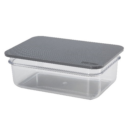 蓋がまな板代わりになるので、大きなまな板をわざわざ出す必要がない。 - 食材が滑りにくいエンボス加工。本体と密着する溝は、食材を切るときに汁漏れを防ぐ。