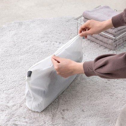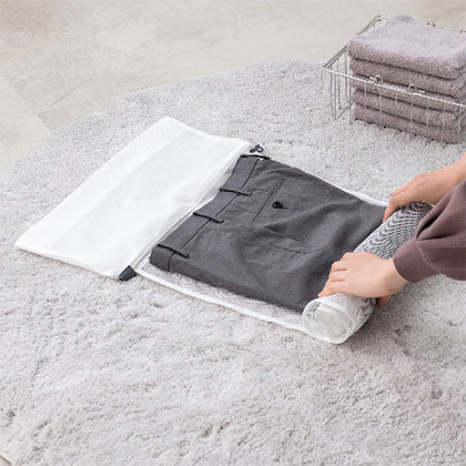 - ズボンやワンピースをクッションポールに巻いて洗うことできる洗濯ネット。